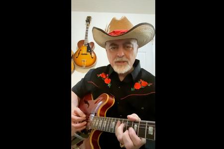 My style of rhythm guitar is based on the flowing, walking, progressions of Eldon Shamblin. He began with Bob Wills in 1937 and Bob soon noticed that all the bass players he encountered played a basic, static pattern. Bob asked Eldon to move the music around and he developed a way of walking the bass note around while playing a chord after each note. I have adopted that style of playing and moved it a little further with more modern harmonizations that enhance the vocals. I call it "Walking Rhythm" guitar!